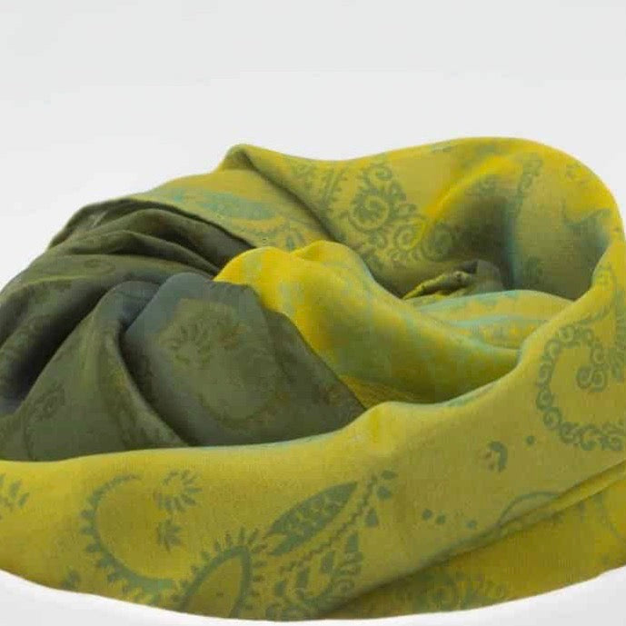 Silk and modal double-sided scarf with printed floral motifs. Shades of Gold versus Green taken from the prickly pear and the Siena Countryside.