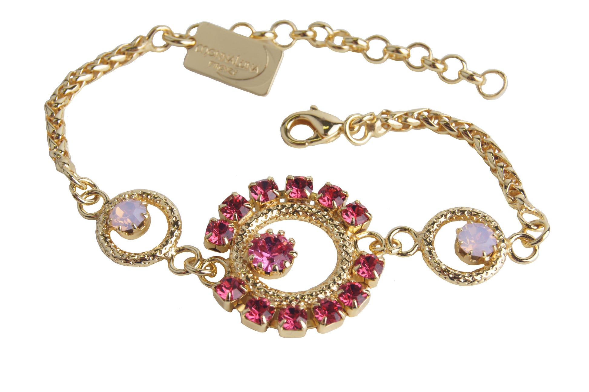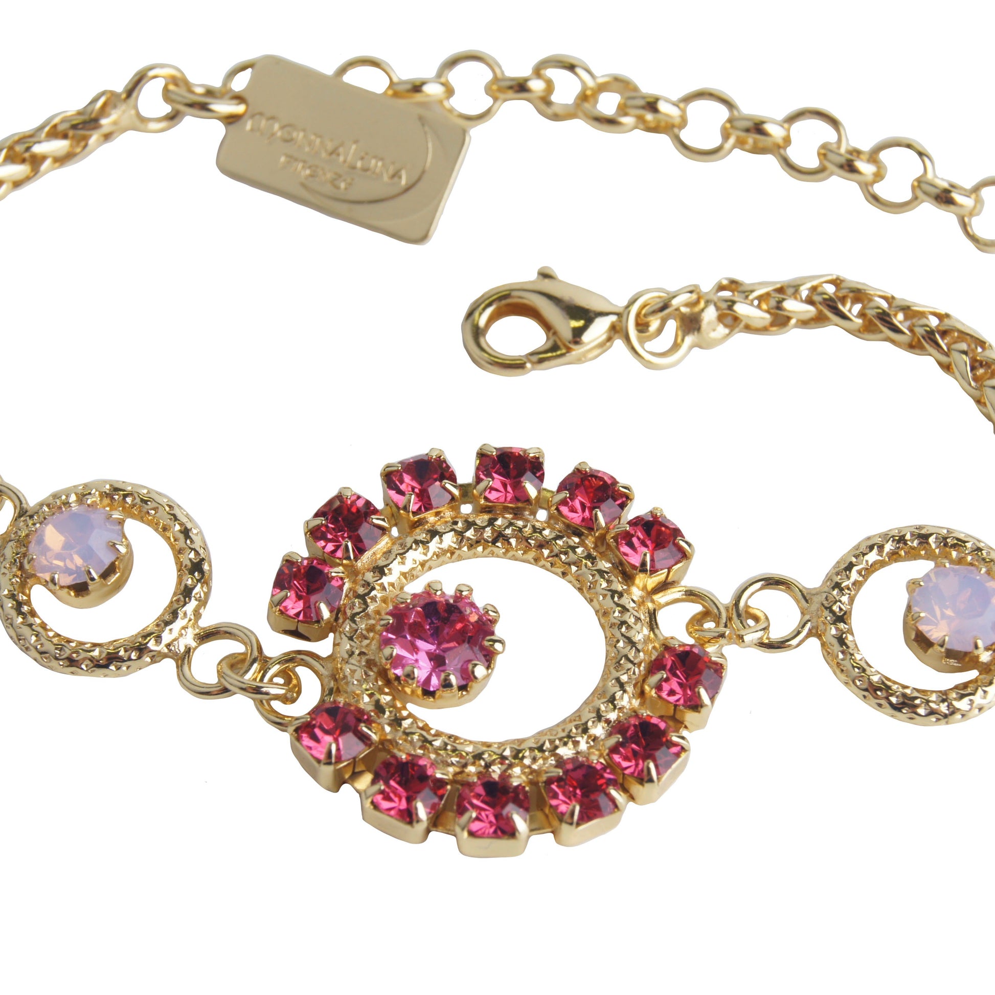 Circle Delight Bracelet with a mix of filigree settings and crystals made of different sized round crystals. The decoration forms a rhomboid decor of colors!