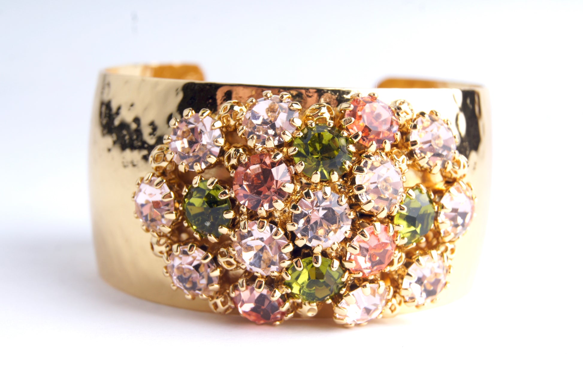 Brass Bangle with a mix of filigree settings and crystals made of different sized round crystals. The decoration forms a rhomboid decor of colors!
