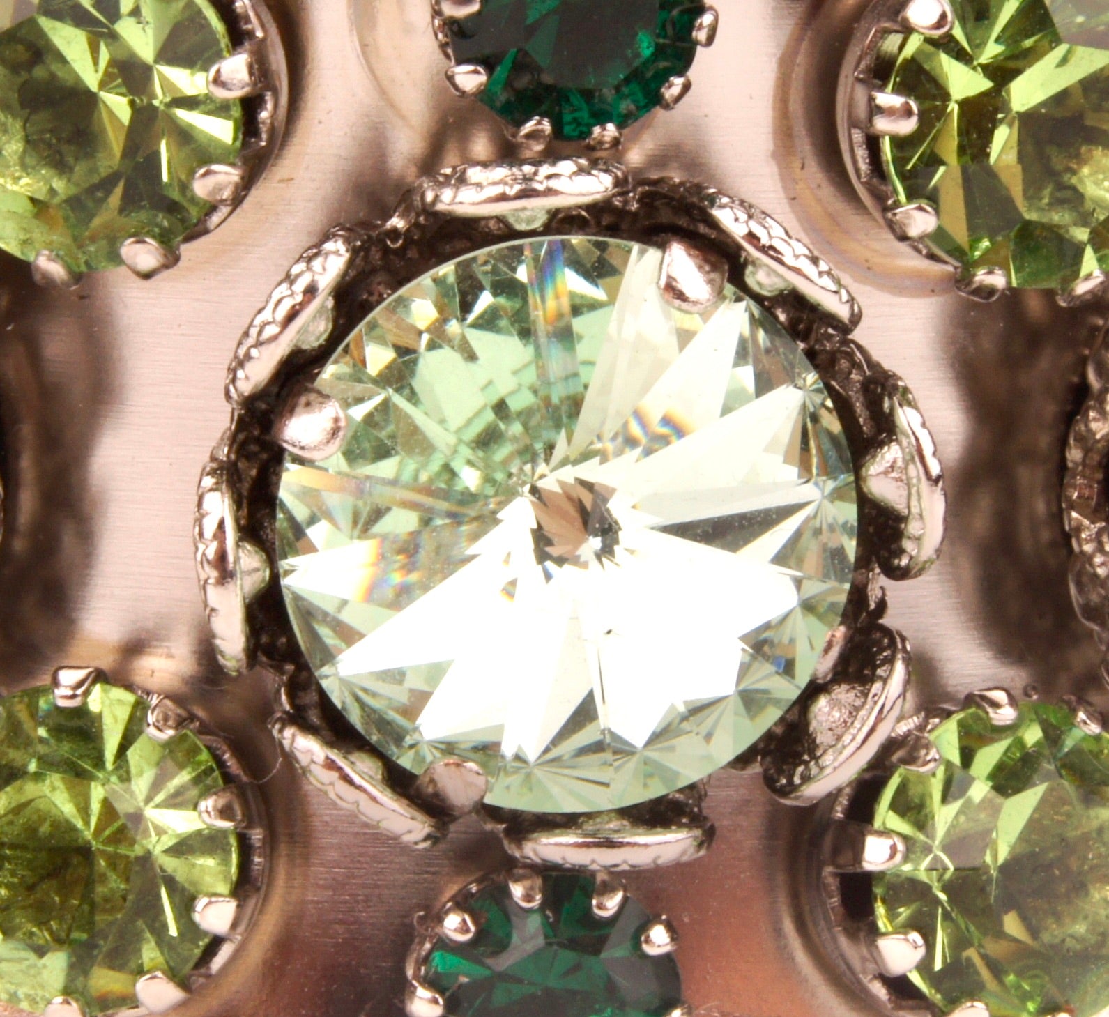 Brass Bangle with a mix of filigree settings and crystals made of different sized round crystals. The decoration forms a rhomboid decor of colors!