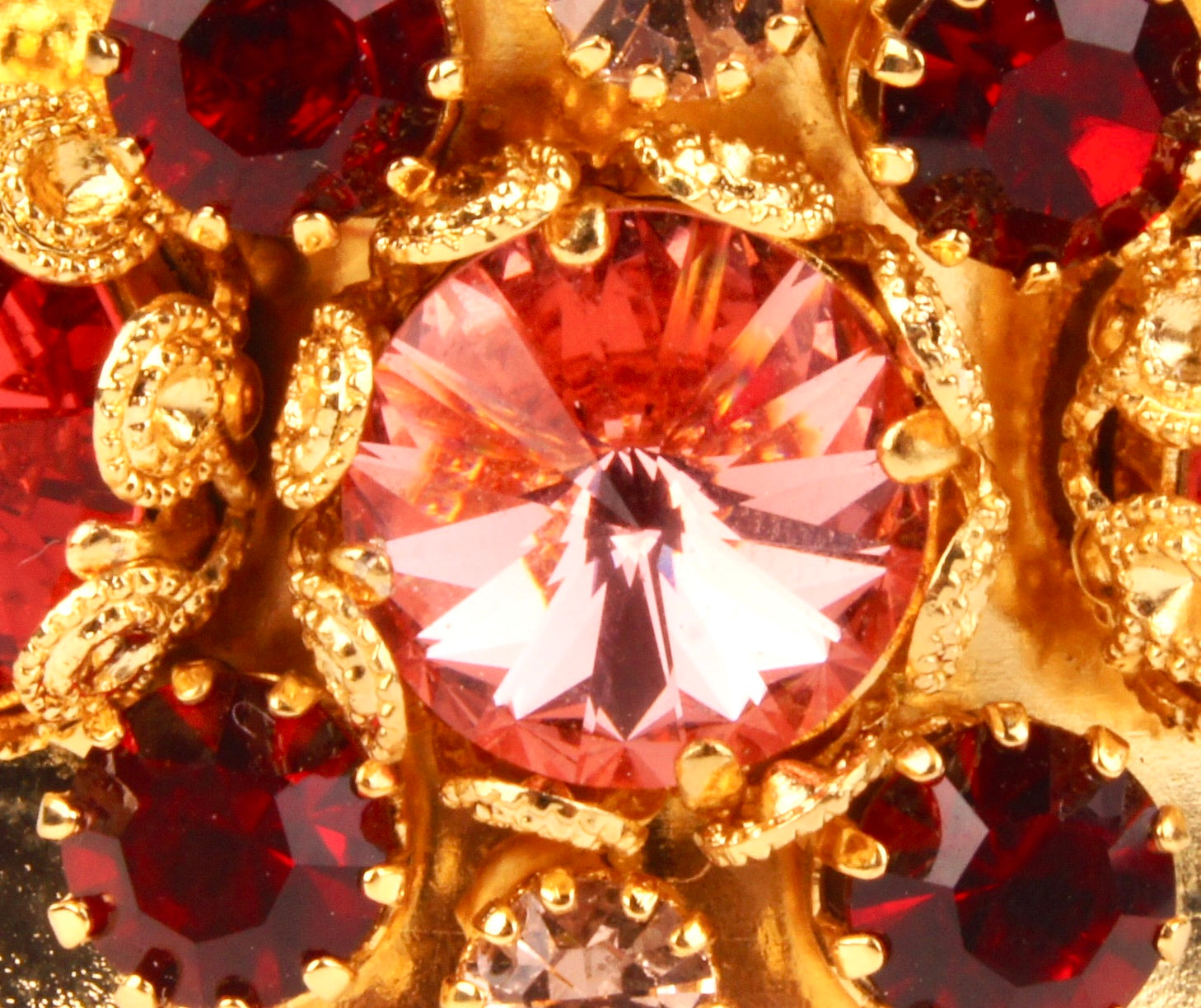 Brass Bangle with a mix of filigree settings and crystals made of different sized round crystals. The decoration forms a rhomboid decor of colors!