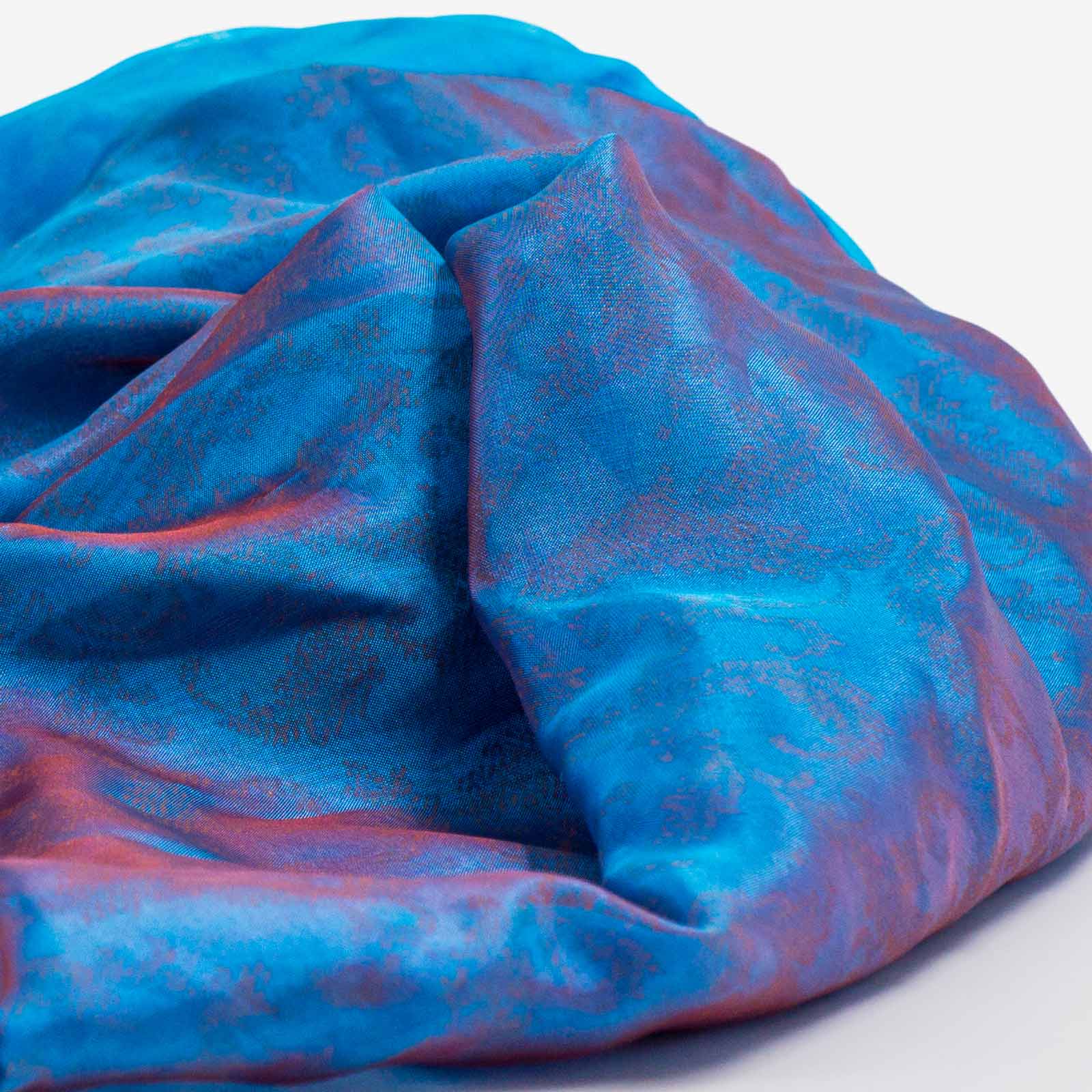 Silk and modal double-sided scarf with printed floral motifs. Shades of Light Blue and Precious Turquoise taken from the Vesuvian city reflected in the Gulf.