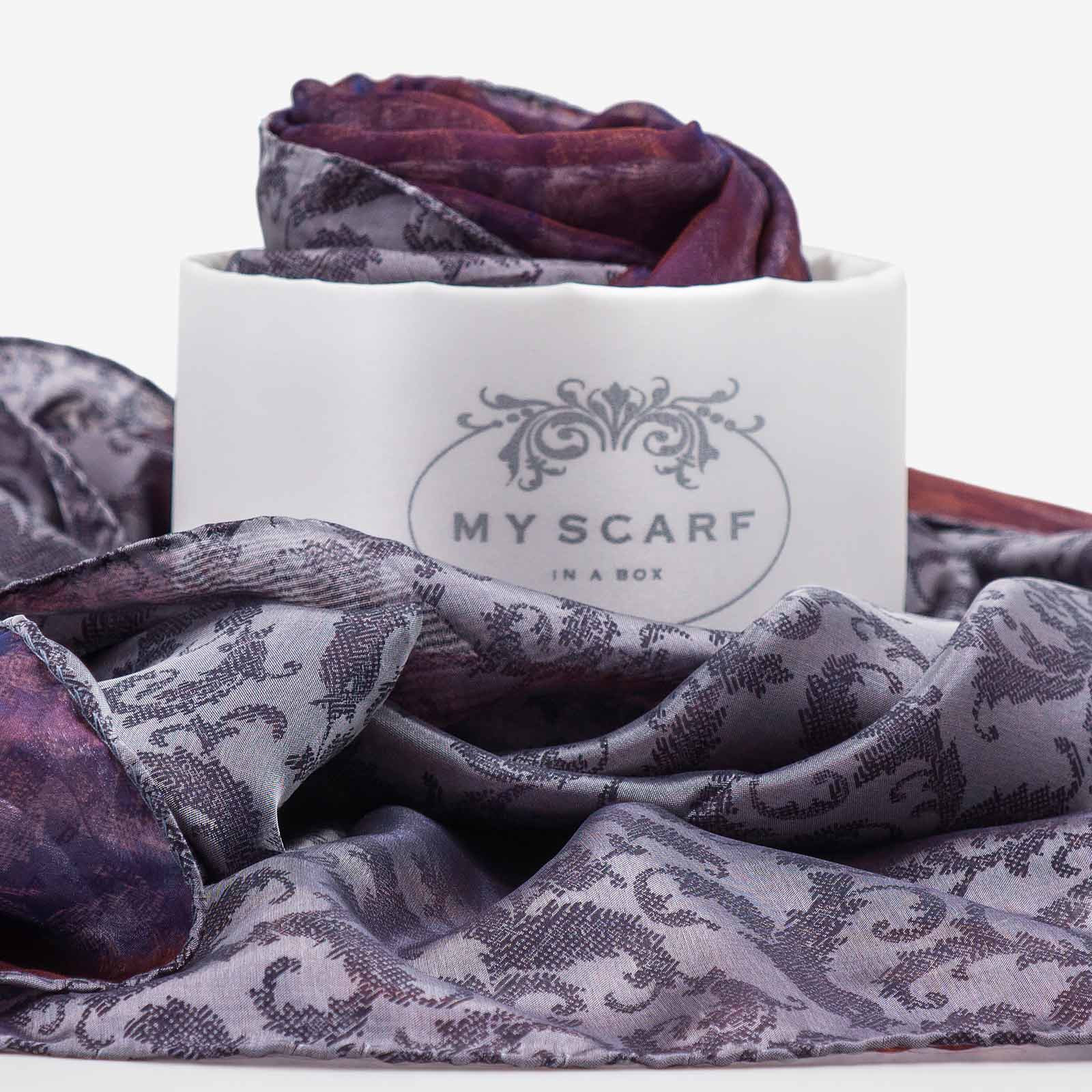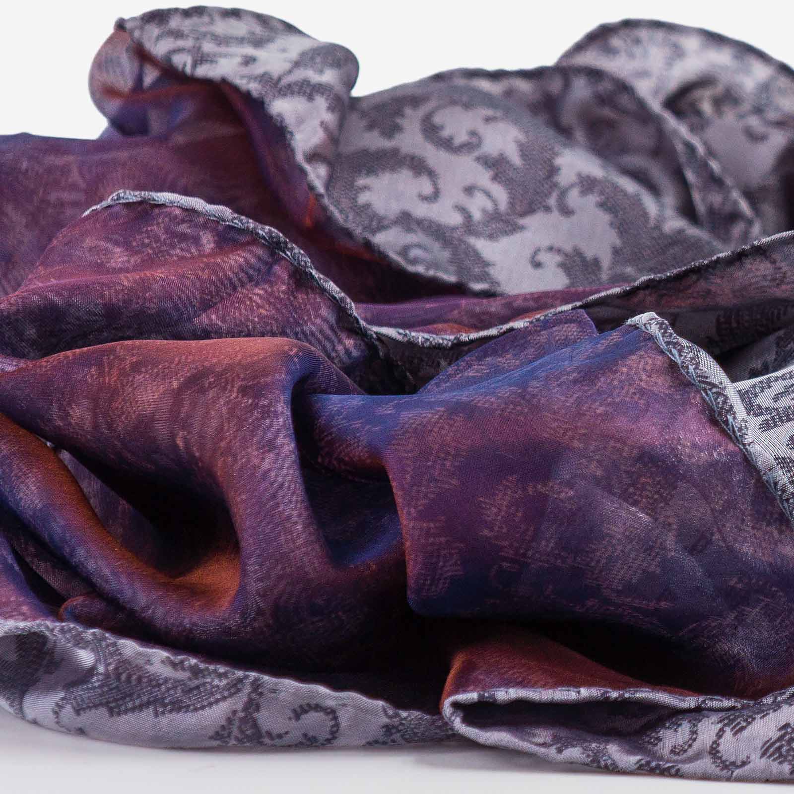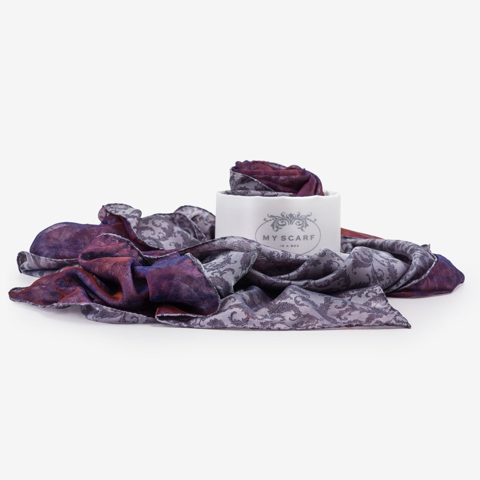 Silk and modal double-sided scarf with printed floral motifs. Shades of Intense Purple and Silver as a tribute to the Tuscan capital and its winery tradition.