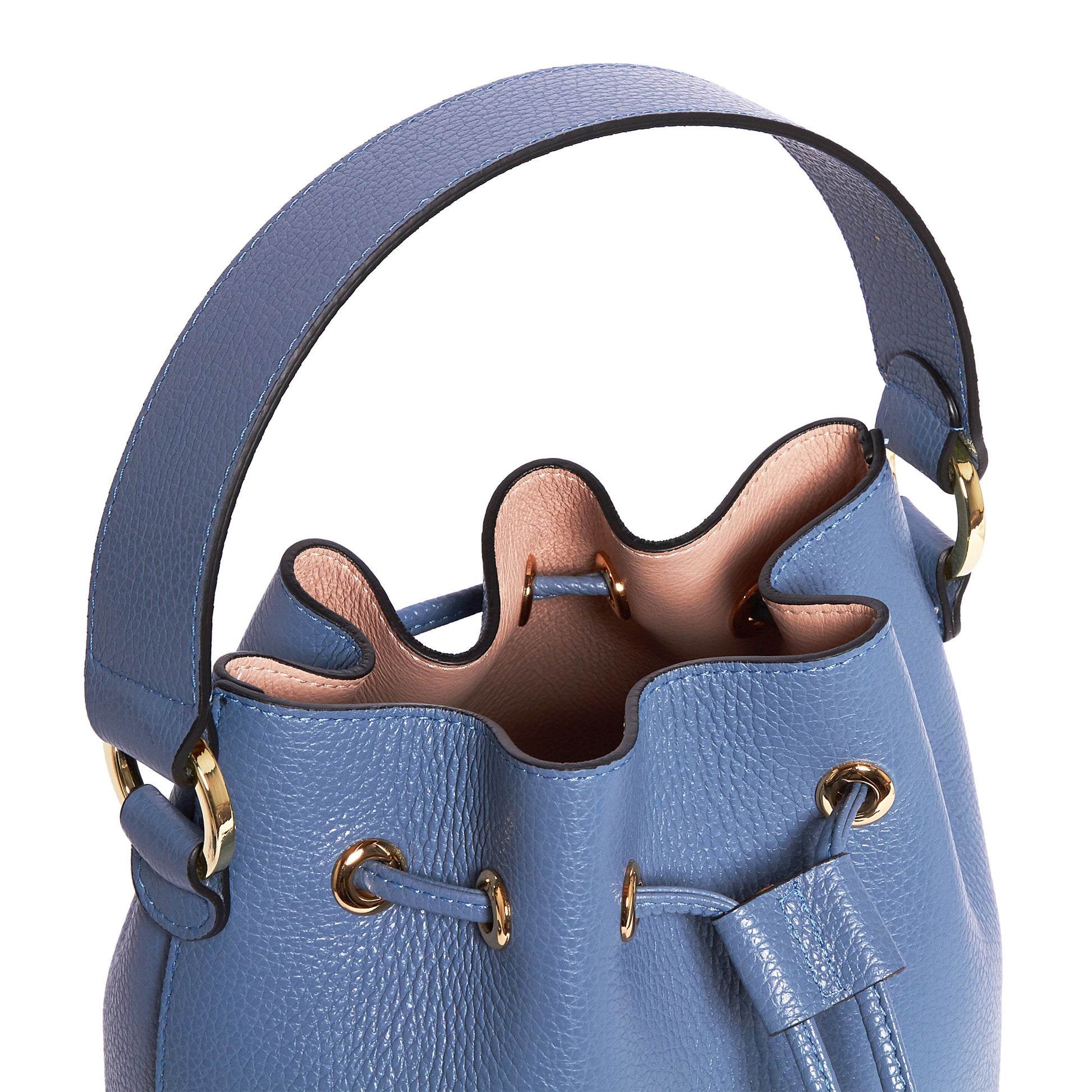 Bucket with handle and removable and adjustable shoulder strap. Logo lettering and gold finishes